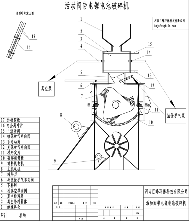 鋰電池經(jīng)絕緣倉進(jìn)活動(dòng)閥真空給料,下閥關(guān)上閥開,進(jìn)料后上閥關(guān),關(guān)后抽空,抽后下閥開入破室,下閥關(guān)給料器腔抽氣,完成給料工序;物料經(jīng)Z腔至破室,Z腔防止物料反彈,破室在貧氧狀(破碎室含氧量在小于2%以下可保證帶電破碎的正常安全性),破室進(jìn)出料閉氧抽空充惰性氣體(常規(guī)用氮?dú)夂投趸迹欢栊詺怏w作用為提高電解液閃點(diǎn)和揮發(fā)點(diǎn),同時(shí)抑制鋰離子從負(fù)極到正極幾率,防止放電發(fā)熱和爆燃;鋰電破碎時(shí)轉(zhuǎn)子刀與底刀相切破,并起摩擦打散防止金屬殼體包裹正負(fù)極片,碎后物料通過真空排料進(jìn)行外排。